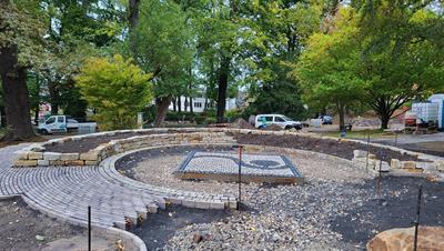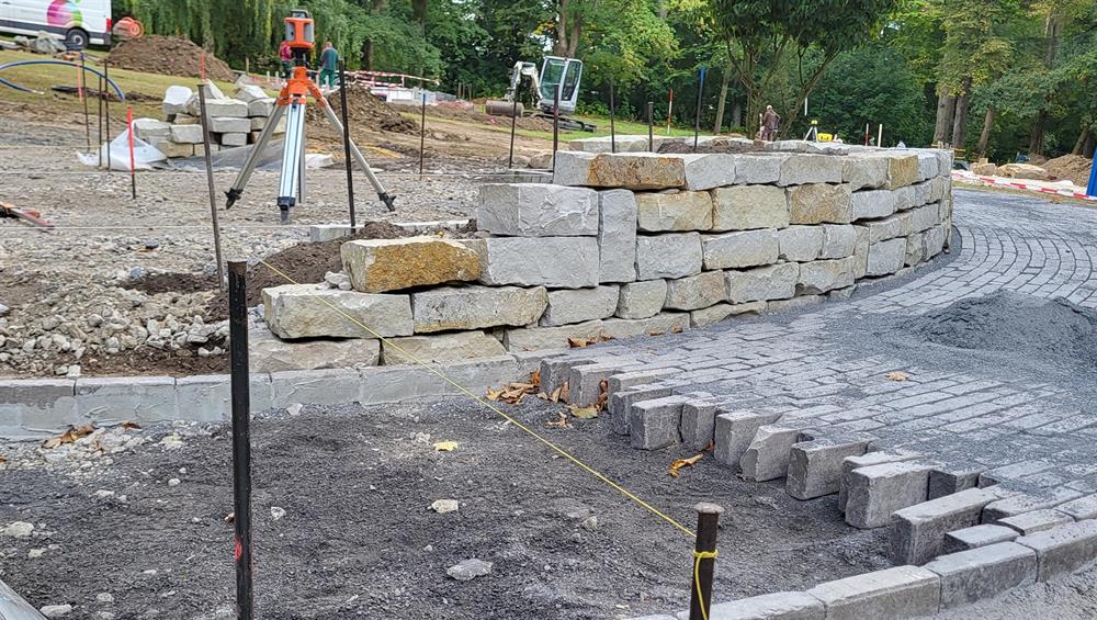 Bei der Auswahl des Materials wurde auf eine warme, natürliche Optik Wert gelegt. Die Sandsteine in den Trockenmauern und auf dem zentralen Platz stammen aus regionalen Steinbrüchen, die Felssteine im äußeren Bereich sind gebrauchtes Material, welches auf dieser Anlage Wiederverwendung findet. Dadurch können lange Transportwege reduziert werden. Die verwendeten Steine sind sind in Beige-Tönen gehalten. Sie sorgen für ein Wohlfühlgefühl und schaffen eine ruhige Atmosphäre der Nachhaltigkeit und Natürlichkeit.